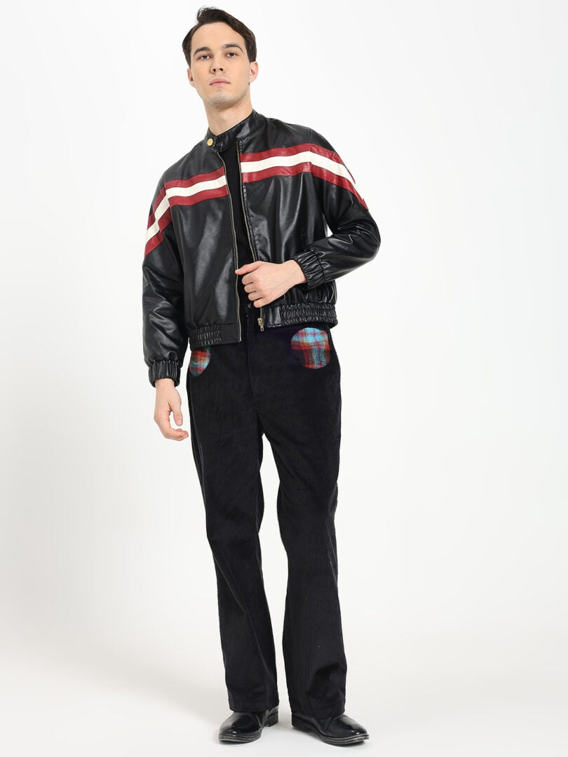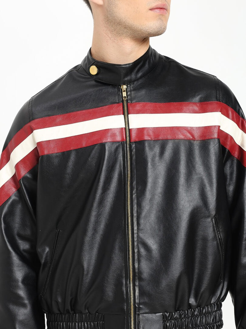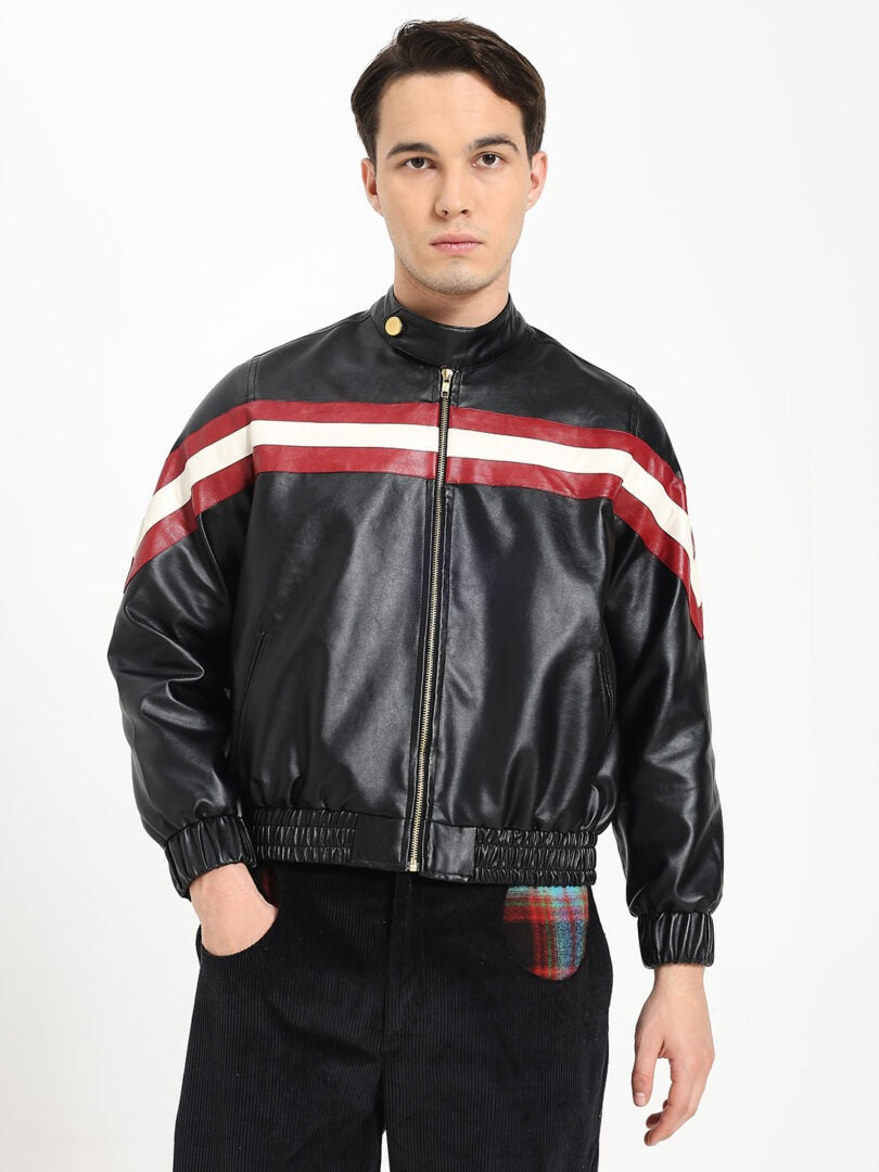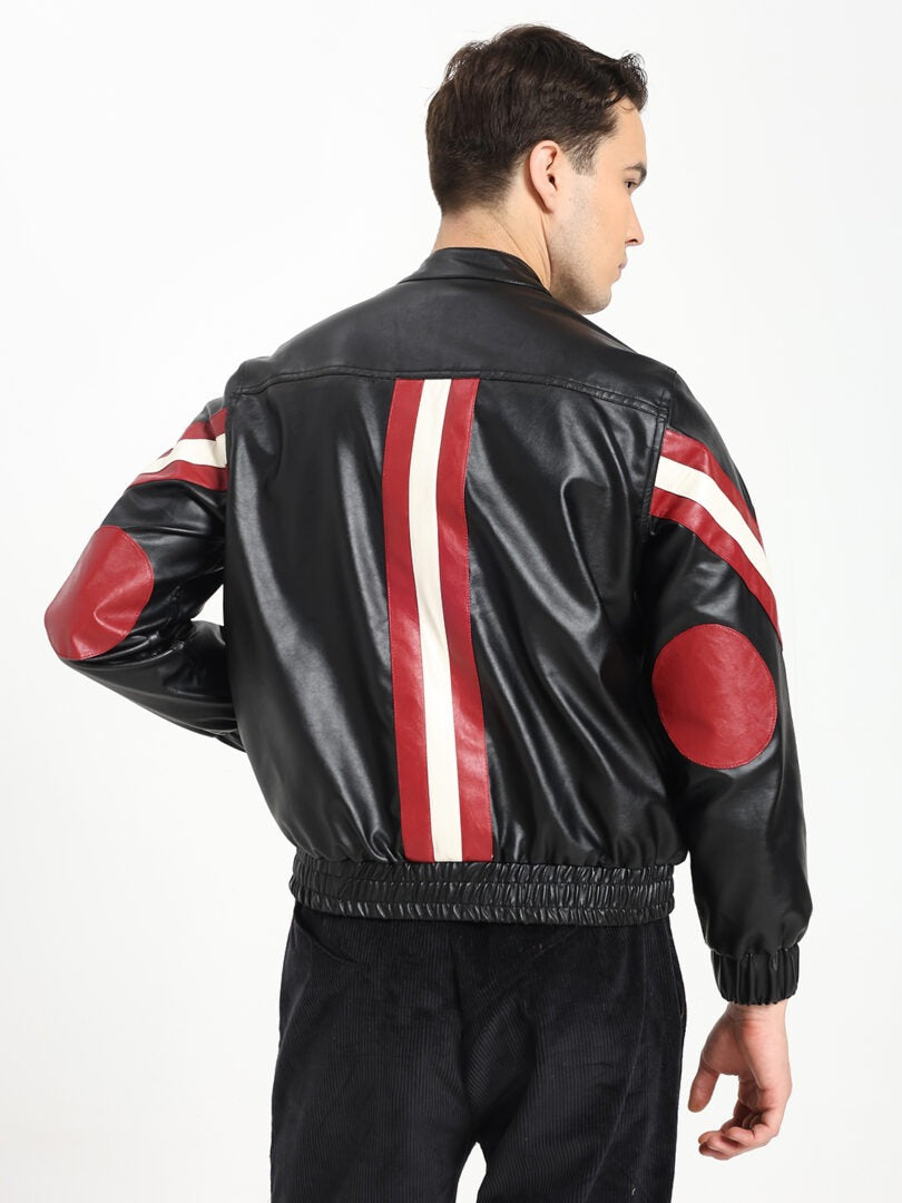 Bold, warm, and undeniably stylish — this biker-inspired bomber jacket is crafted for statement-making comfort. Designed in premium faux leather with dynamic patch stripes, it brings a sporty yet polished edge to cooler days. The front features a sturdy YKK zipper closure and a secure neck button for added structure and warmth. Fully lined for comfort, the jacket includes classic elbow patches and an elastic waist that creates a snug, flattering fit. A perfect blend of biker energy and bomber ease — modern, durable, and effortlessly cool.
