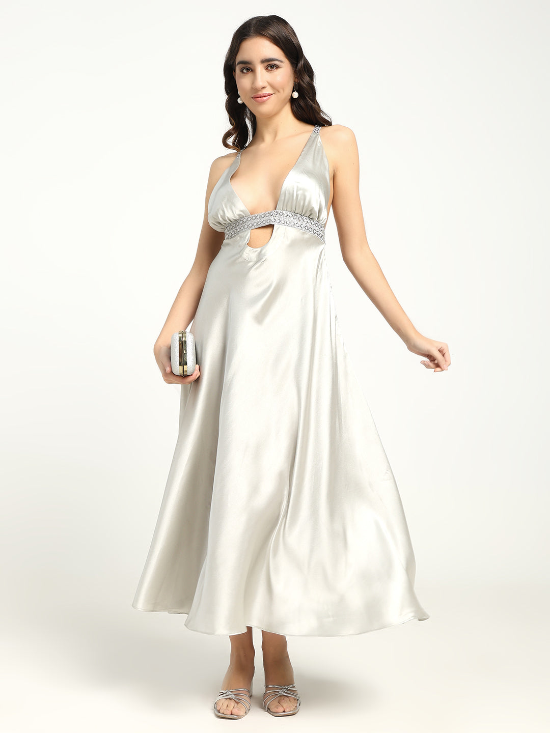A show-stopping silver satin dress with a flowy silhouette, sparkling waist accents, and a daring backless halter design. Pure celestial charm. Composition Satin Double-lined bust