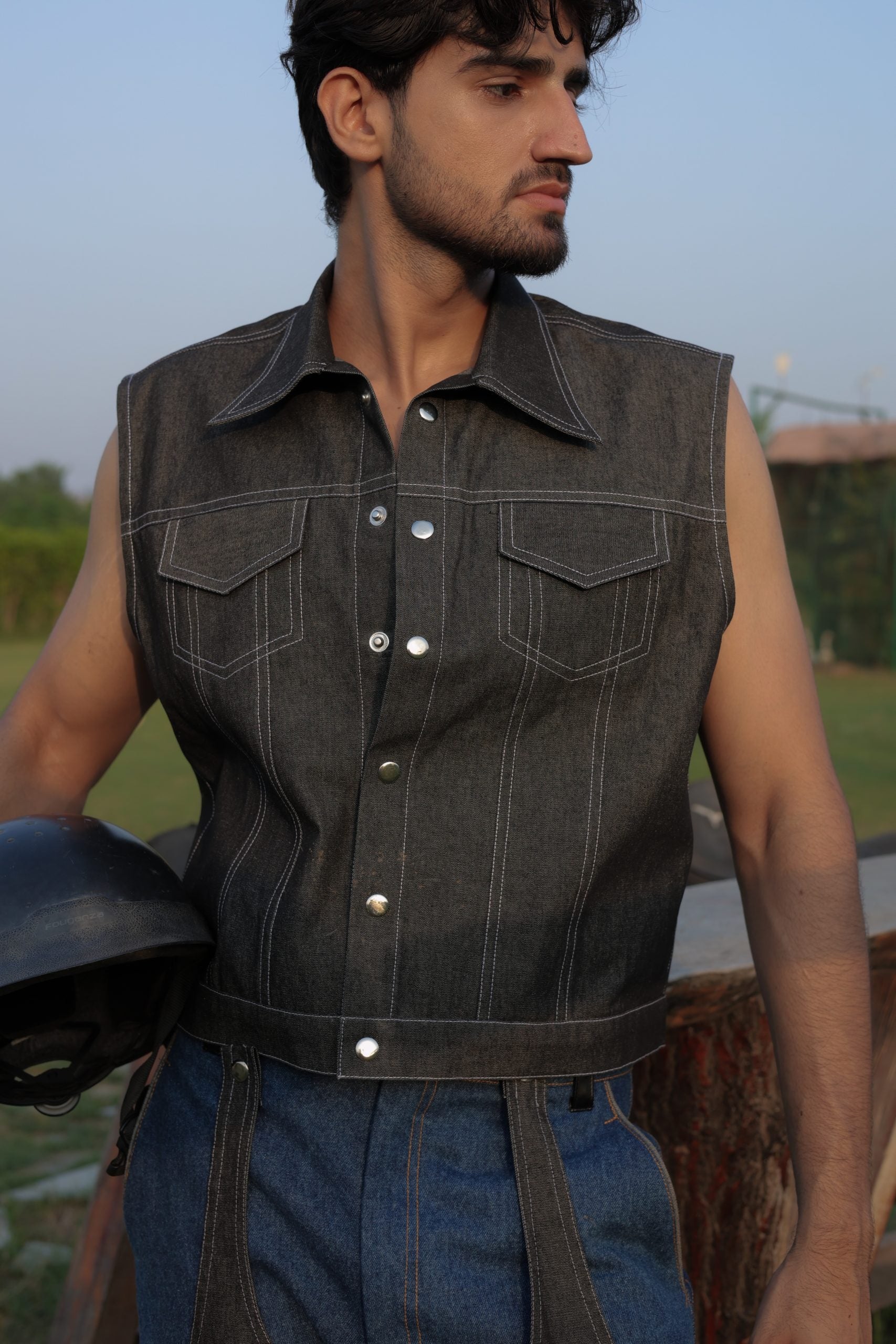 This slightly cropped denim vest-style jacket features paneling for a structured look, accentuated by contrast stitching that adds a pop of visual interest. It includes front flap pockets on the chest, combining functionality with style. The tailored fit and unique design make it a versatile piece, perfect for layering over casual or smart outfits.